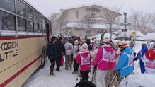 昨晩から今朝にかけて待ちに待った降雪があり、昨日よりずっと良いコンディションでスキーをすることが出来ました。午後の講習中には、志賀高原のご当地ゆるキャラ、おこみんが応援に。生徒たちは練習の疲れも忘れ、おやつのおしるこに舌鼓を打ちました。