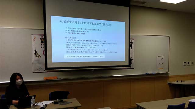 ・今回の講義でK-POPの歴史について初めて知ることができました。私が中学2年生の時に初めてK-POPの存在を知り、気づいたら流行っていたので、流行るまでの過程を知ることができてとても面白かったです。また初めはH.O.T.などの、今とは違うかっこよさをもつ人たちが当時の若者たちの心を動かしていたことが印象的でした。好きなことを研究としてみることでより詳しく知れて、更に好きになれるので参加してよかったです。[高校1年]