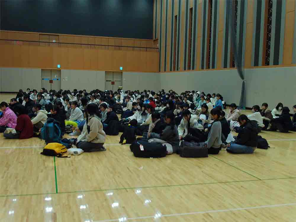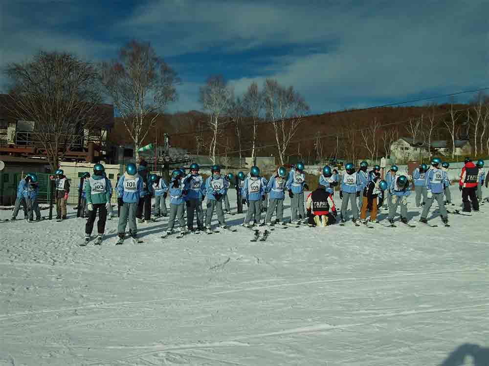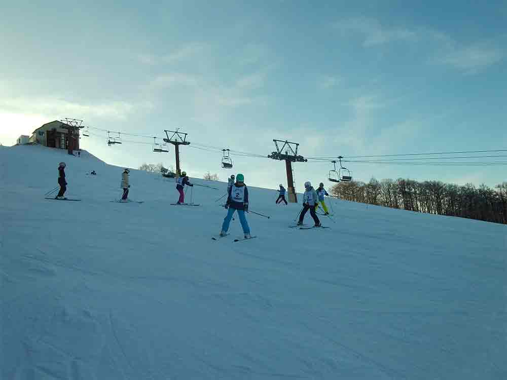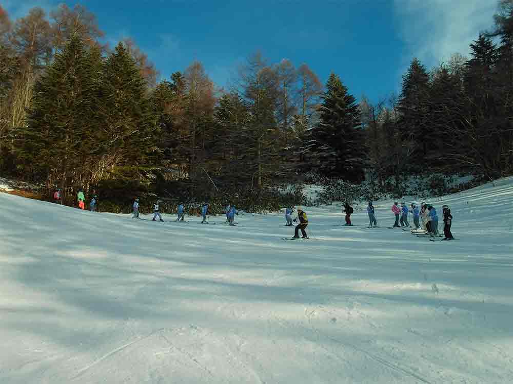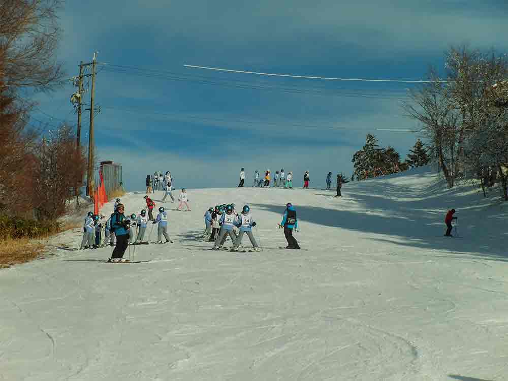 ホテルに到着して昼食と開校式を済ませ、バスに乗ってゲレンデに移動しました。初めてスキーに挑戦する生徒はブーツに足を突っ込むだけでも一苦労でしたが、インストラクターの方にブーツの履き方を一から教わり、スキー板を装着して感覚をつかむところから始めました。経験者班は、すぐにリフトに乗ってコースへ。雪が少なくて滑れるコースは限られていますが、青空の下で全員がのびのびと気持ち良さそうに滑っていたように感じます。