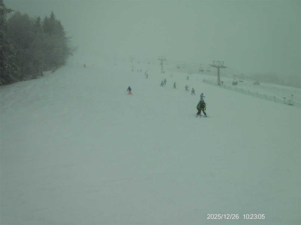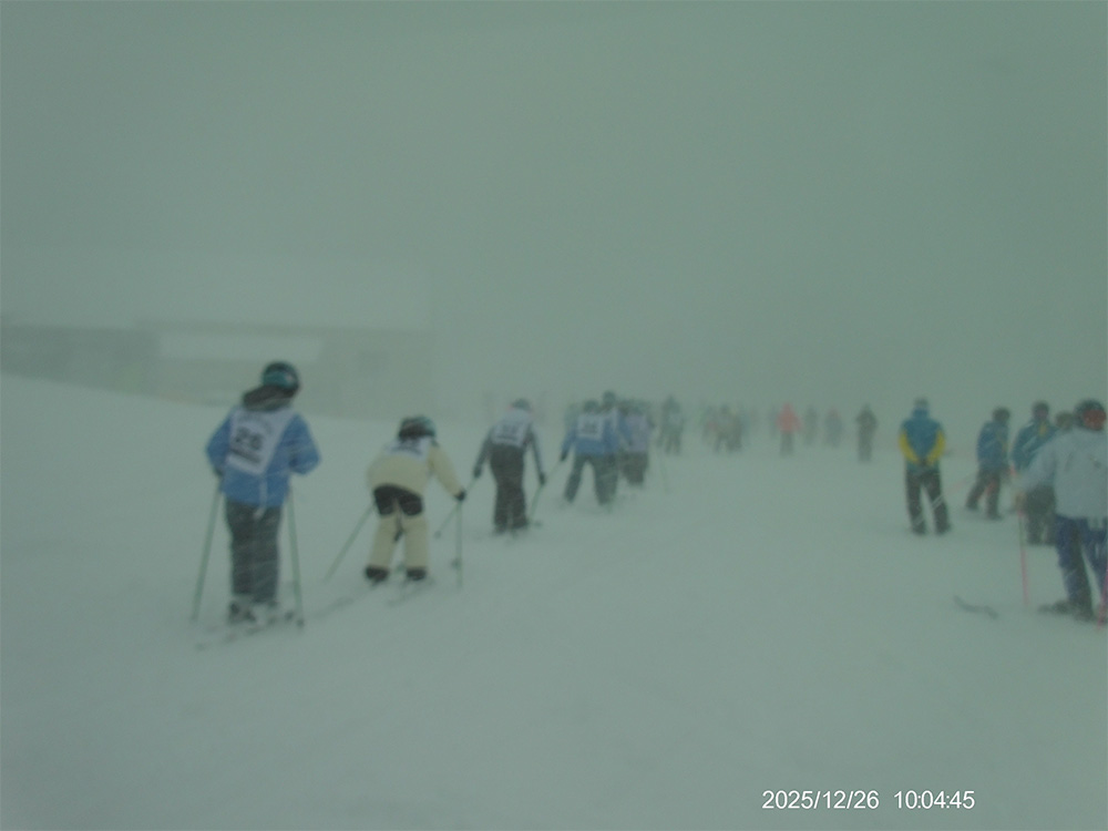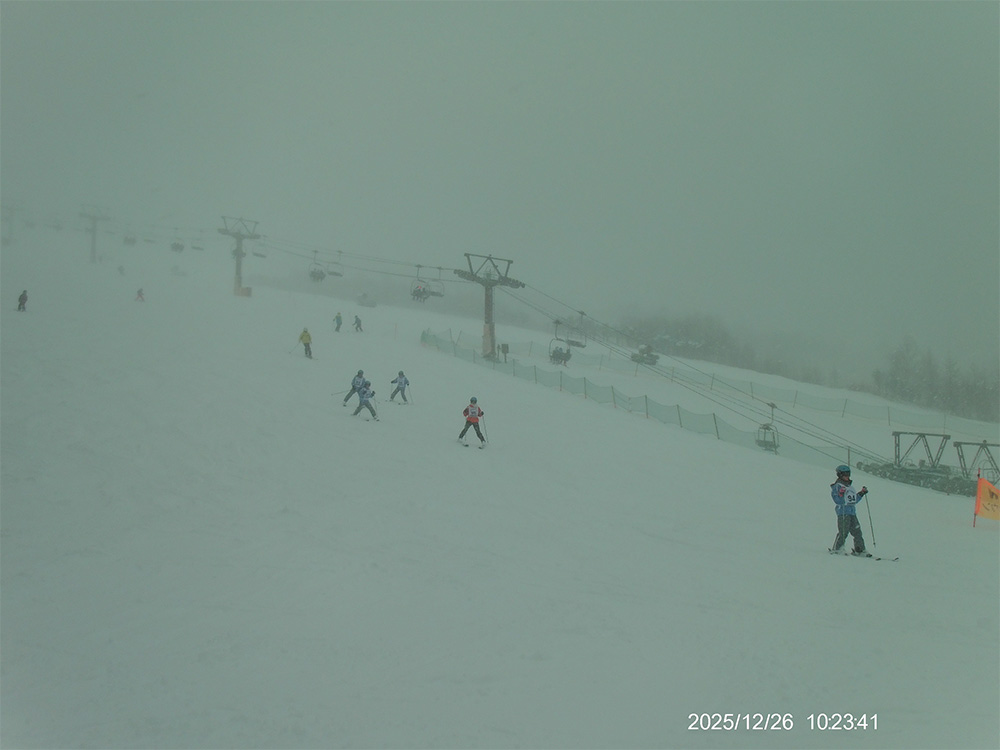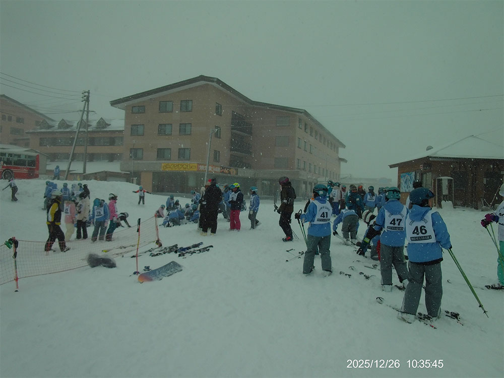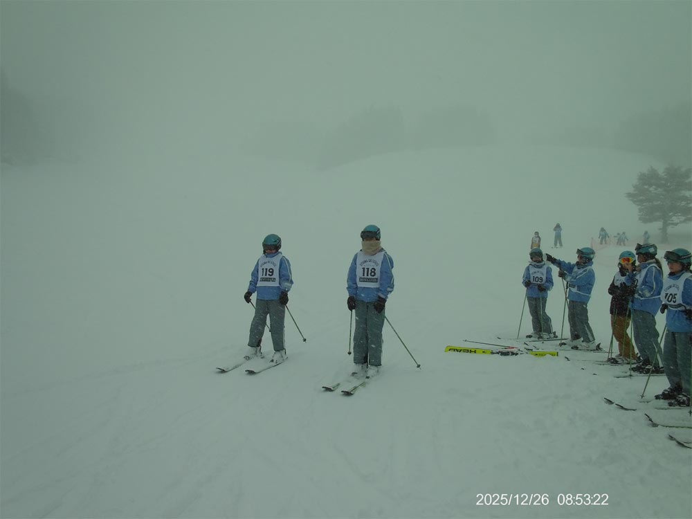 雪が降り続けてゲレンデはふかふかでしたが、新雪で少し滑りにくさを感じた生徒もいたことでしょう。昨日よりも更に寒くなり、横から吹きつける雪で視界が遮られたこともあって、最終日に最大の試練が待ち受けていました。雪と風にさらされた頬は真っ赤に染まり、雪が積もった髪やネックウォーマーは凍り、レッスン時間が2時間弱でちょうどよかったのかもしれません。寒いと言いながらも迎えのバスが来るギリギリまで雪で遊んでいた生徒は若い証です。