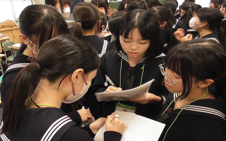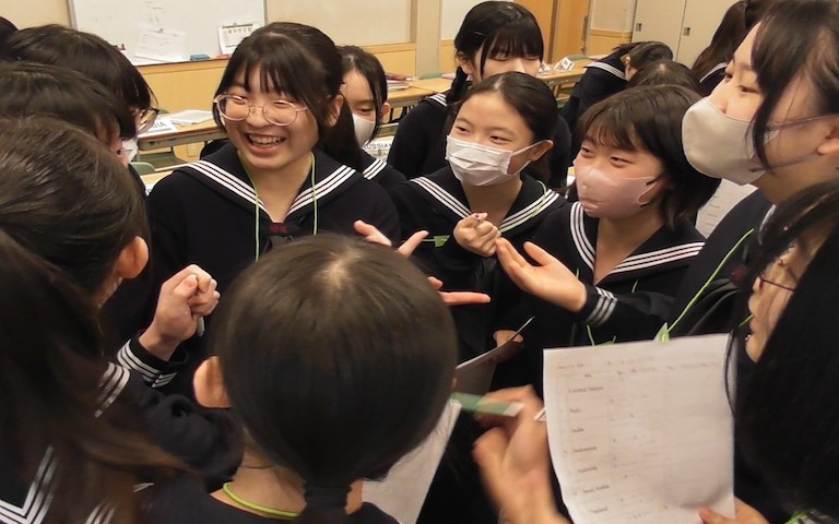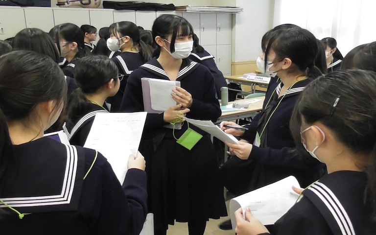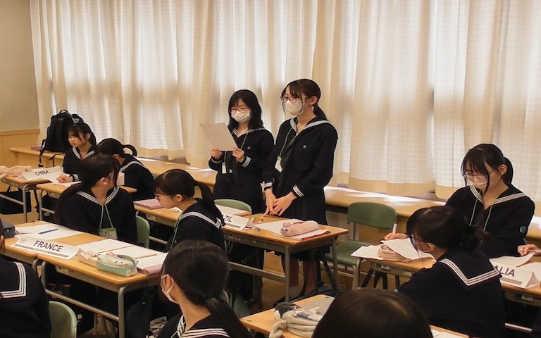 中学1年生の英語グローバル・スタディーズ(GS)では、毎年恒例となっている模擬国連を実施しました。議題は、SDGs弁当。 宗教上の制約や各国の特産品など様々なことを考慮しながら、世界の誰もが幸せに食べられるお弁当の考案に向け、自国の国益と国際益の両方を守る議論に臨みました。