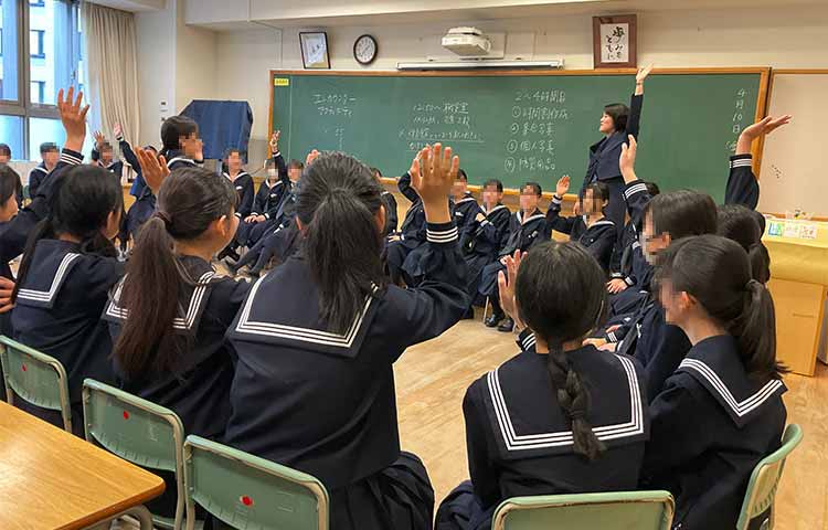 中学1年生は、入学して最初の2日間で「ガイダンス」を行いました。 学校生活のきまりを理解したり、校舎を見学したりと、 大妻中学校の一員としての心得を学ぶ充実した時間となりました。 2日目には、グループエンカウンターを行いました。クラス対抗でゲームを行ったり、友達との共通点を見つけることができたり、どのクラスも大盛り上がりの時間となりました。 これからたくさんの時間をともに歩んでいく仲間と、楽しみながら関係を築くことができました。