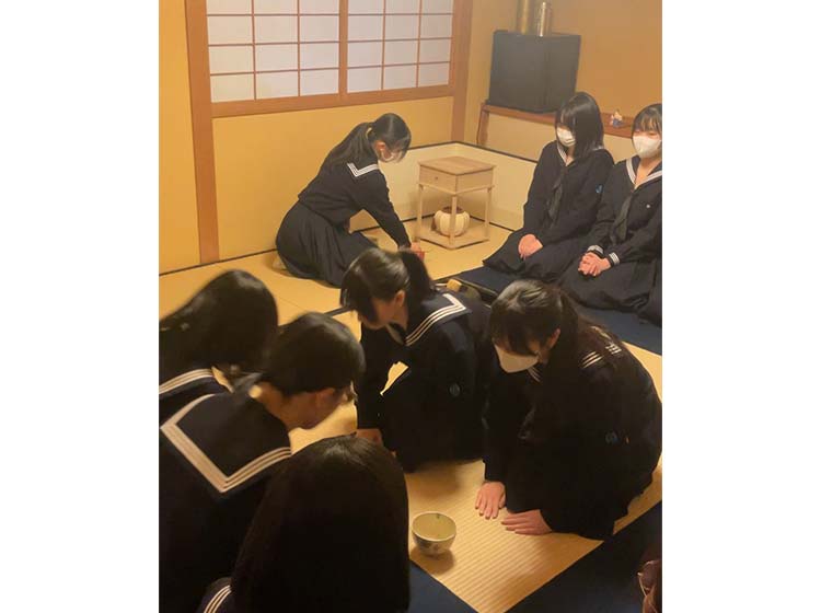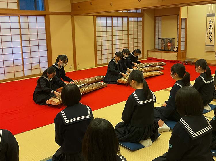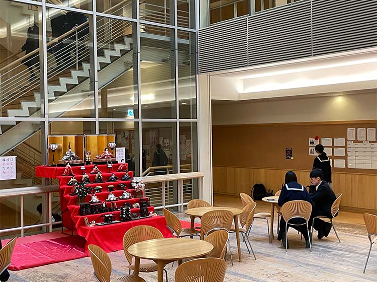 ごきげんよう。中3PR部です。 先日、中高生徒会主催のひな祭りイベントが開催されました。 和室では箏曲部による箏の演奏や日本舞踊部による演技、茶道部によるお点前の披露などがありました。3階ラウンジでも生徒会による雛人形や華道部によるお花の展示があり、全校生徒がひな祭りを一足先に感じる事ができました。